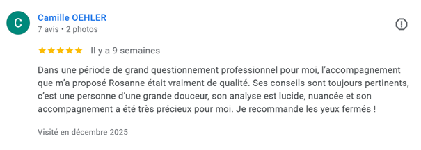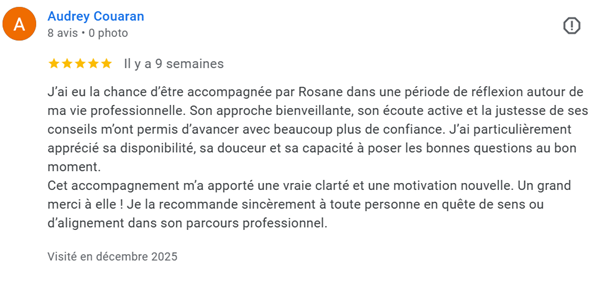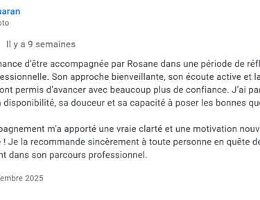 Rosanne a été un véritable phare à cet instant précis pour moi :-) Par sa capacité à écouter finement et surtout à toujours questionner l'essentiel, elle m’a offert l'espace nécessaire pour prendre du recul et me reconnecter avec ce qui comptait réellement pour moi. En une séance, j’ai trouvé de la clarté, de la confiance et la capacité d’affirmer mes conditions avec alignement.