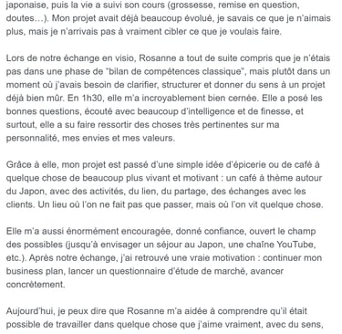 J'ai fait appel à Rosanne à un moment où je me sentais complètement bloquée professionnellement. Je devais préparer un entretien décisif pour une proposition d’association, mais je me sentais incapable d’y voir clair : difficulté à poser mon cadre, à identifier ce qui était juste pour moi, et encore moins à l’exprimer face à mon interlocutrice. J'avais peur, je me sentais confuse.