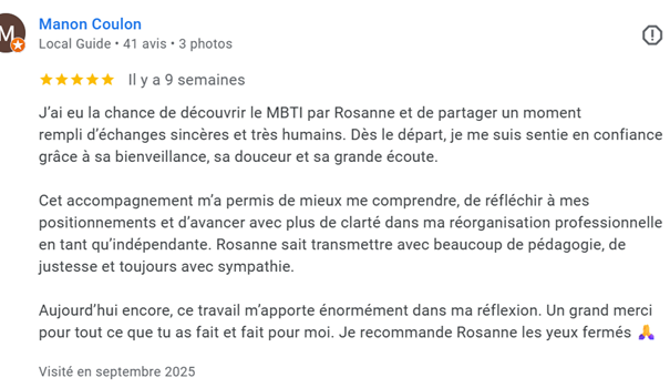 Ce que Rosanne m’a transmis continue de m’accompagner dans ma vie professionnelle comme personnelle, cela a redonné une place claire à ce qui est juste pour moi. Merci Rosanne 🤍